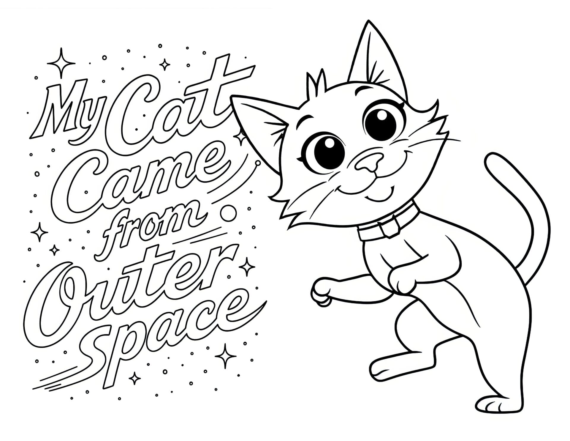 ¡Despegue hacia la diversión de colorear con nuestras páginas para colorear GRATUITAS de «Mi Gato es un Extraterrestre» o consiga el libro para colorear GRATUITO de 15 páginas!