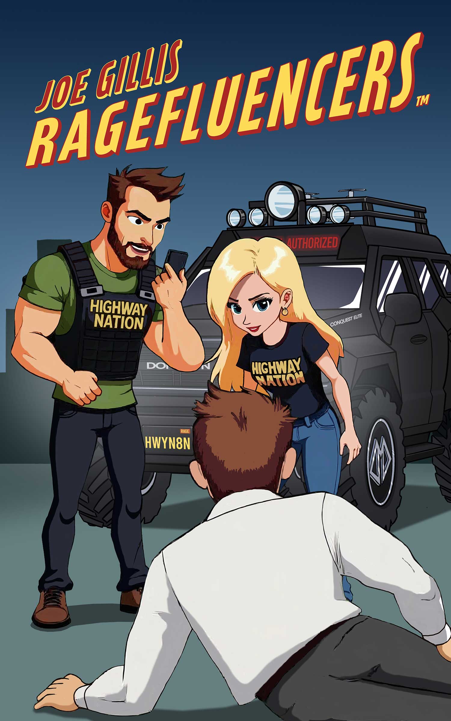 El póster estilo cómic para "Ragefluencers" de Joe Gillis muestra los ojos de una mujer en un espejo retrovisor encima de un SUV con luces en el techo. Este thriller de influencers le invita a "¡Prepárese para la experiencia de su vida!", una aventura salvaje de furia en la carretera y sátira de las redes sociales.